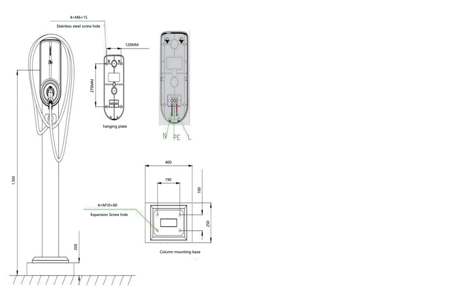 1) Зарядтау қадасының бетон іргетасының беріктігі С25 болуы керек. Жер асты бөлігі 400мм, ал жер үсті бөлігі 200мм. Бетон өлшемдері 400*250мм. Іргетастың ортасында жерленген шығыс құбыры болуы керек, ал іргетасқа 4 M10*60 кеңейту болттары бекітілуі керек.