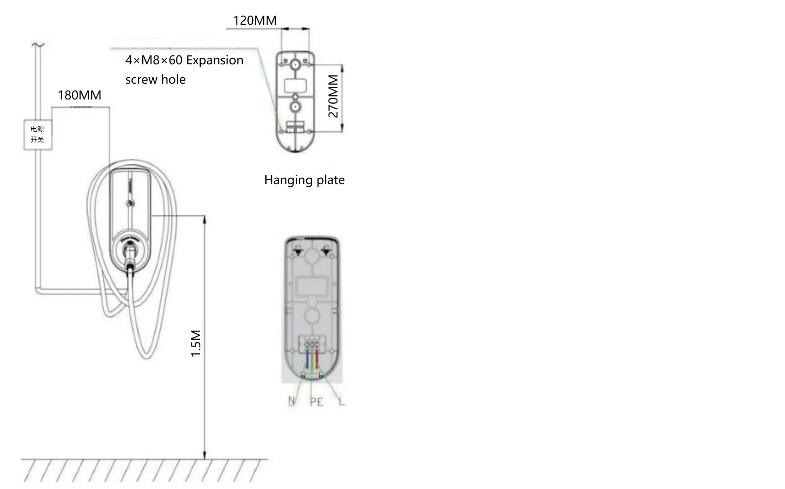 1) Зарядтау қадасының жерден биіктігінің анықтамалық деректері (1,3-1,5 метр)2) Қабырғадағы артқы тақтайшадағы бекіту саңылауының орнын артқы тақтайшадағы бекіту тесігінің орнына сәйкес белгілеңіз.